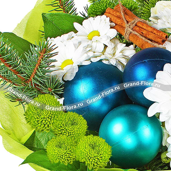 Уменьшенный: хризантема белая - 2шт., роза белая - 1шт., хризантема зеленая (сантини) - 1шт., еловая ветвь, корица, новогодний декор и зелень, фетр.