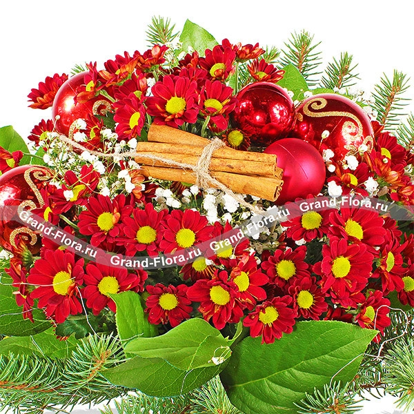 Уменьшенный: хризантема красная ромашковидная - 3шт., гипсофила - 3шт., еловая ветвь, корица, новогодний декор и зелень, сетка.