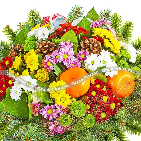 Стандартный (на фото): хризантема кустовая белая - 3шт., хризантема кустовая желтая - 3шт., хризантема кустовая красная - 3шт., хризантема кустовая розовая - 3шт., хризантема зеленая (сантини) - 3шт., еловая ветвь, новогодний колокольчик, новогодний декор и зелень, сетка.