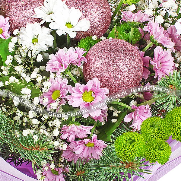 ДЕЛЮКС: хризантема белая ромашковидная - 6 шт., хризантема розовая ромашковидная - 8 шт., хризантема зеленая (сантини) - 6 шт., гипсофила - 7 шт., еловая ветвь, новогодний декор и зелень, фетр.