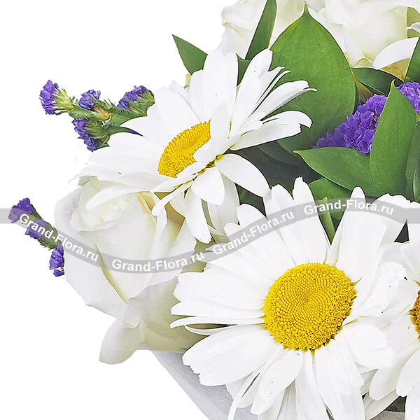 Стандартный (на фото): ромашка белая - 6 шт, роза белая - 5 шт, статица, рускус, фетр белый, бант.