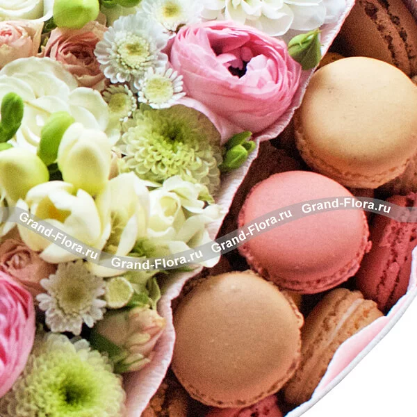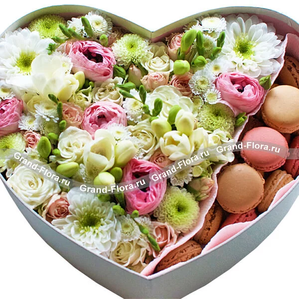 Стандартный (на фото): хризантема белая - 1 шт., хризантема белая (сантини) - 2 шт., фрезия белая - 4 шт., рунункулюс розовый - 5 шт., роза кустовая розовая - 1 шт., оазис, макарунс - 15 шт., коробка большая в виде сердца (30х30см).
