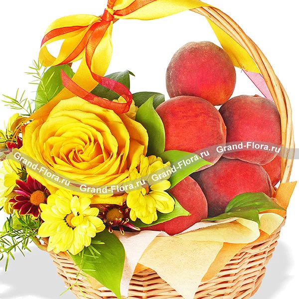 Стандартный: роза желтая - 1 шт., хризантема желтая кустовая - 1 шт., хризантема бордовая - 1 шт., рускус - 2 шт., аспарагус - 1 шт., оазис, фетр желтый, бант красно-желтый, корзина средняя, персики - 1,5 кг.