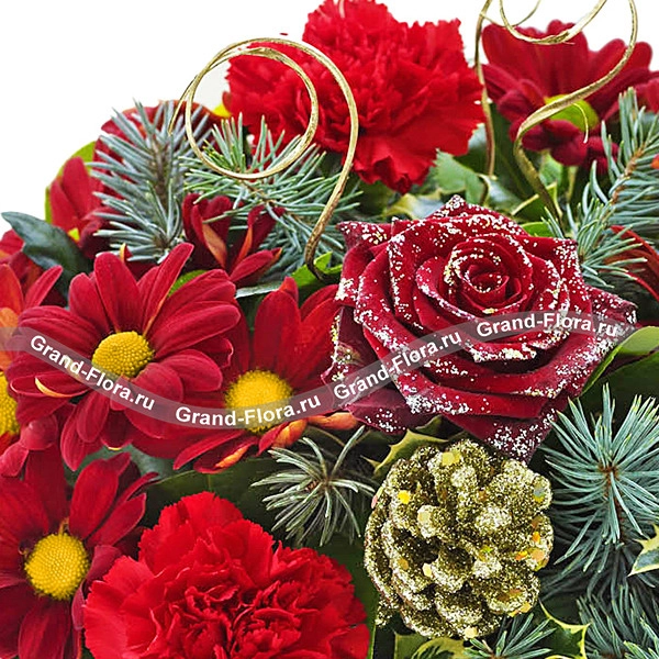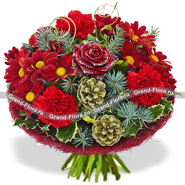 Уменьшенный: Роза красная - 1 шт., хризантема кустовая красная - 2 шт.,гвоздика красная - 2 шт., салал - 2 шт., еловая ветвь - 2 шт., шишки декоративные (маленькие)- 2 шт., сизаль красный (упаковка), красная лента.