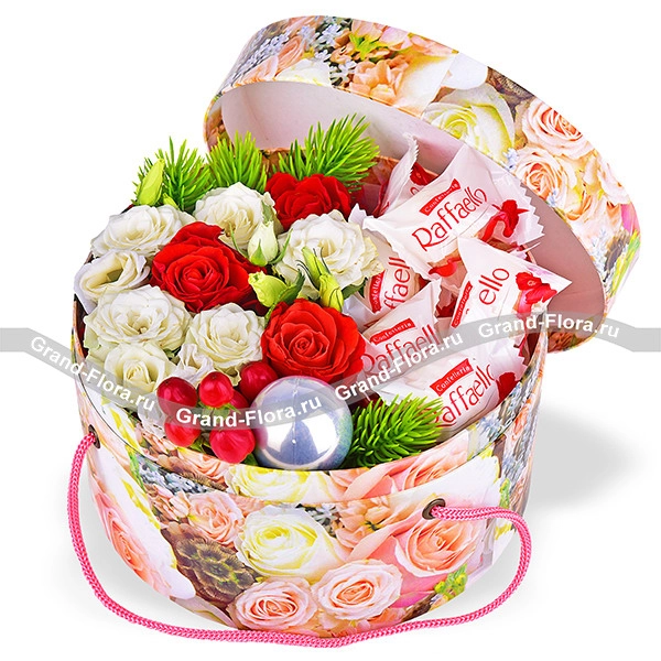 ДЕЛЮКС: роза красная - 9 шт., роза кустовая белая - 8 шт., гиперикум - 4 шт., ель, конфеты Raffaello, елочная игрушка – 4 шт., оазис, коробка.
