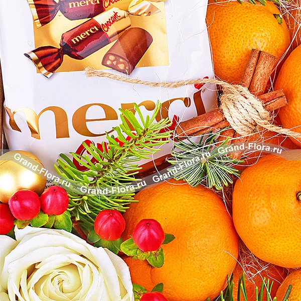 Стандартный (на фото): роза белая - 1шт., гиперикум - 1шт., ель, елочные игрушки -3 шт., корица - 2шт., мандарины - 0,5 кг., конфеты "Merci", коробка.