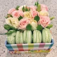 Уменьшенный: роза кустовая розовая - 2 шт., роза кустовая белая - 1 шт., макаруны (возможна замена на зефир), декор, оазис, коробка малая.