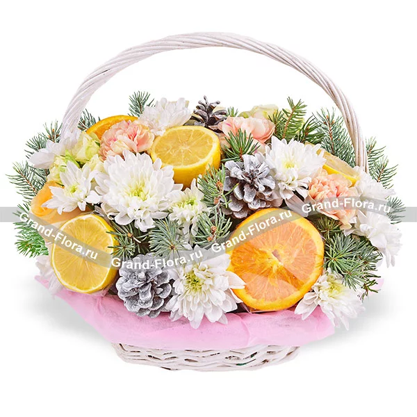 Стандартный: хризантема кустовая белая - 3 шт., гвоздики персиковые - 3 шт., роза желтая - 3 шт., ель, шишка - 3 шт., апельсин - 1 шт., лимон - 2 шт, оазис, корзина средняя.