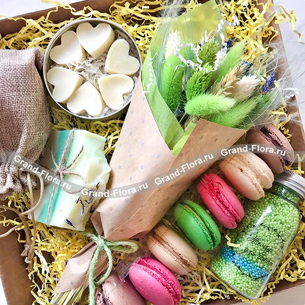 Стандартный: натуральная косметика на основе эфирных масел (жемчуг для ванны, брусочек мыла, гидрофильные плиточки для тела, бомбочка для ванны), набор макарун - 1 уп.,, букет из сухоцветов, открытка, подарочная коробка, наполнитель.