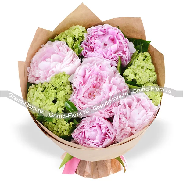 Стандартный: пионы розовые - 6 шт., вибурнум зеленый - 5 шт., упаковка, лента.