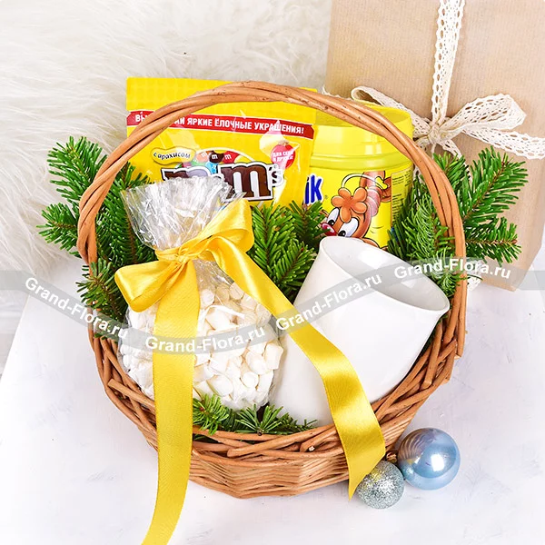 Стандартный: кружка - 1 шт., какао "Несквик" - 250 г., шоколад "M&M's" - 240г., маршмеллоу - 100 г., ель., корзина малая.