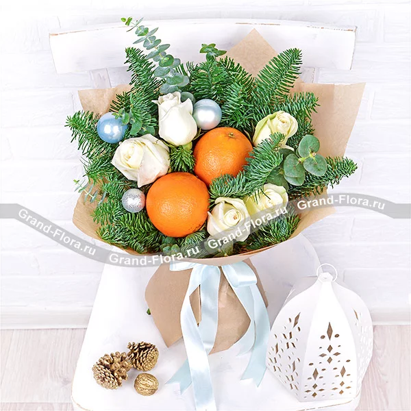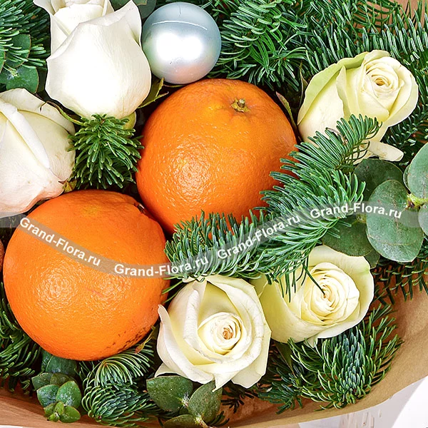Стандартный(на фото): роза белая - 5 шт., апельсин - 2 шт., шарики - 3 шт., ель, эвкалипт, упаковка крафт, лента.